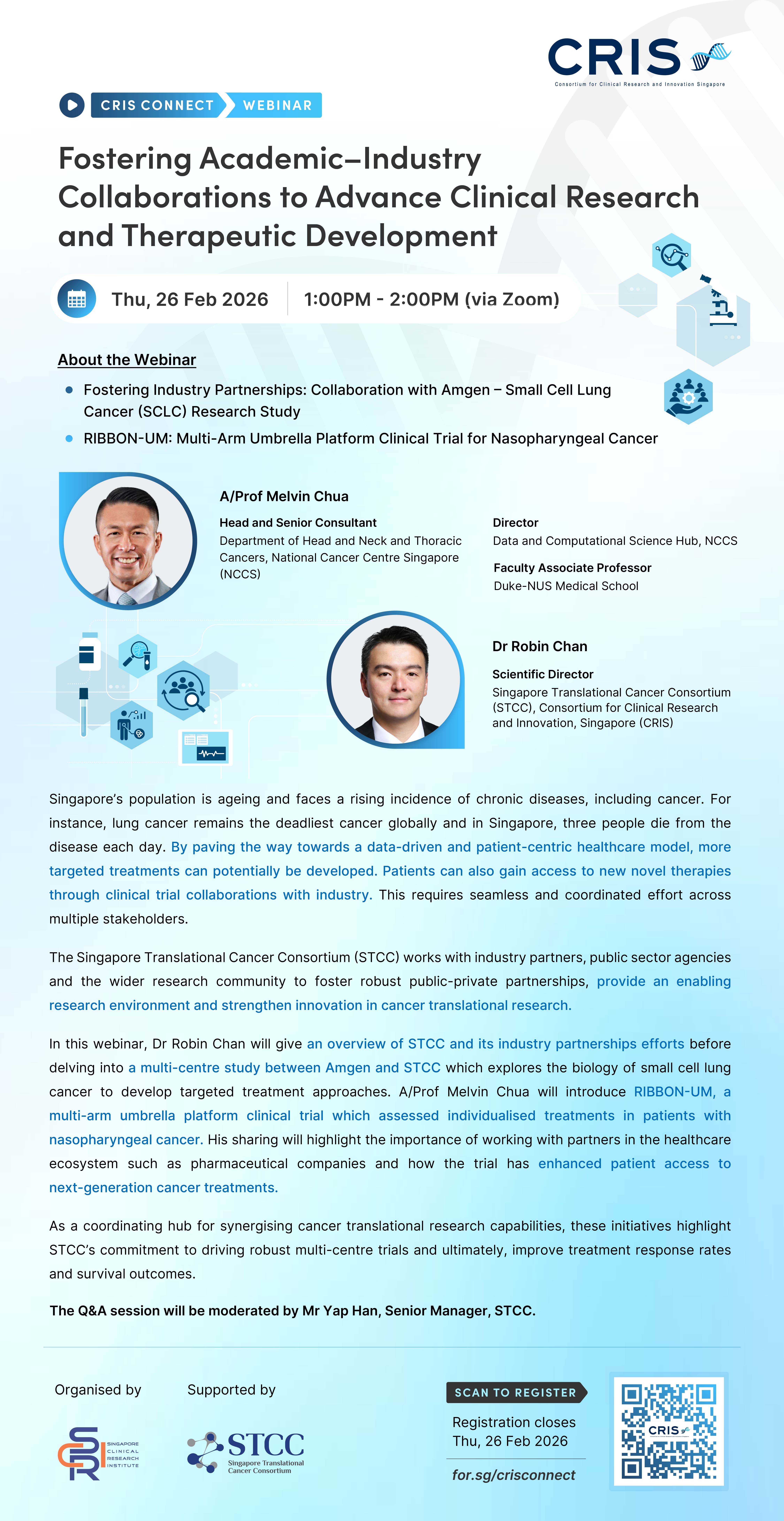 As the Scentific Director of Singapore Translational Cancer Consortium (STCC), Dr Robin Chan oversees the development and coordination of collaborative, investigator-led cancer research across Singapore’s public healthcare and academic institutions. His work involves strengthening translational research platforms, supporting investigator-initiated studies, and fostering strategic partnerships that bridge healthcare institutions, academia, and industry.