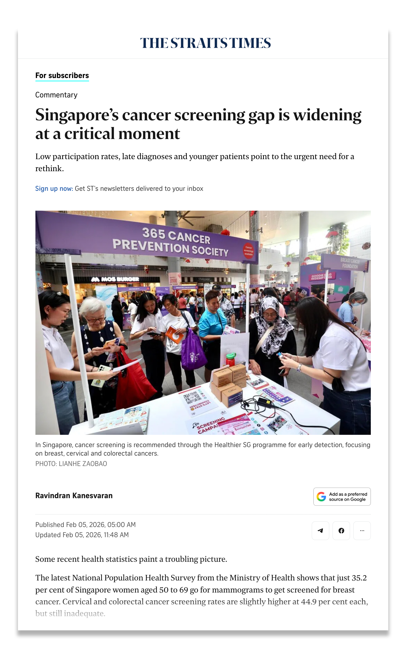 Singapore’s cancer screening gap is widening – at a time when the consequences of inaction are becoming harder to ignore. In his latest commentary, Prof Ravindran Kanesvaran highlights a worrying disconnect and calls for urgent action: despite national screening programmes, participation rates remain low, even as cancer diagnoses rise sharply among younger adults.